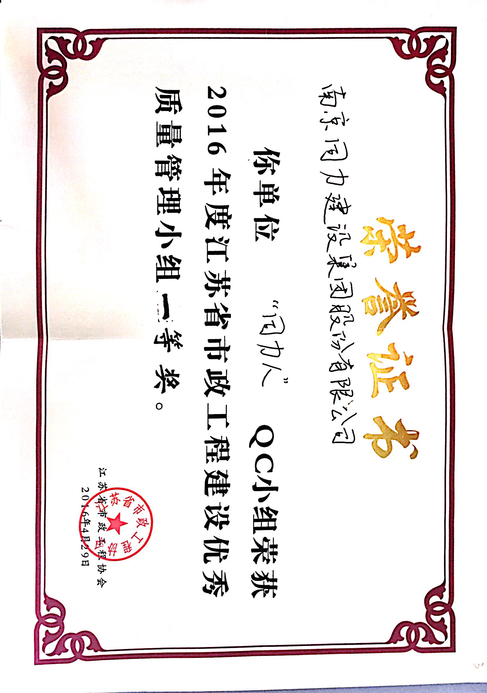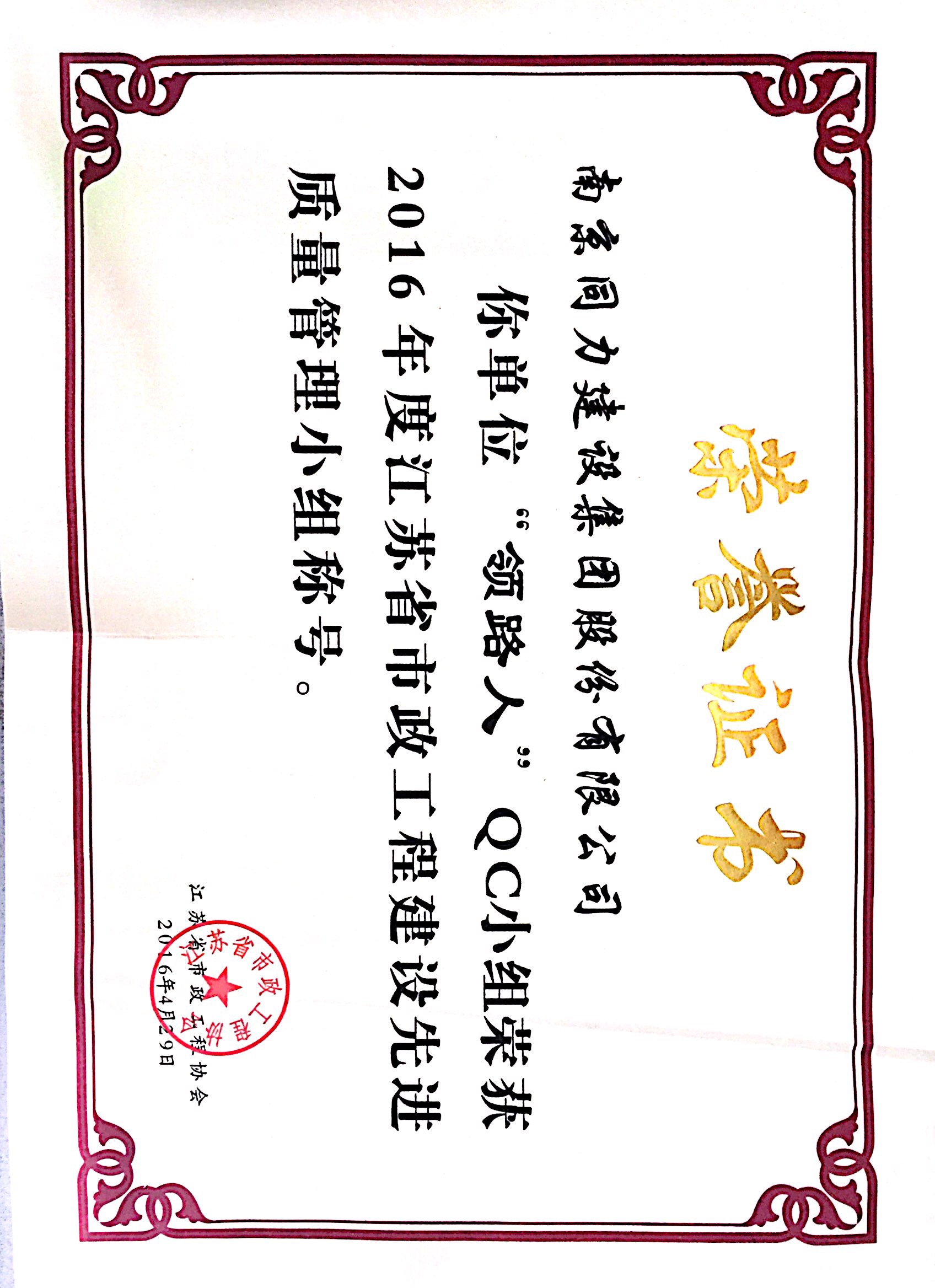 “領路人”QC小組獲得“2016年度江蘇省市...