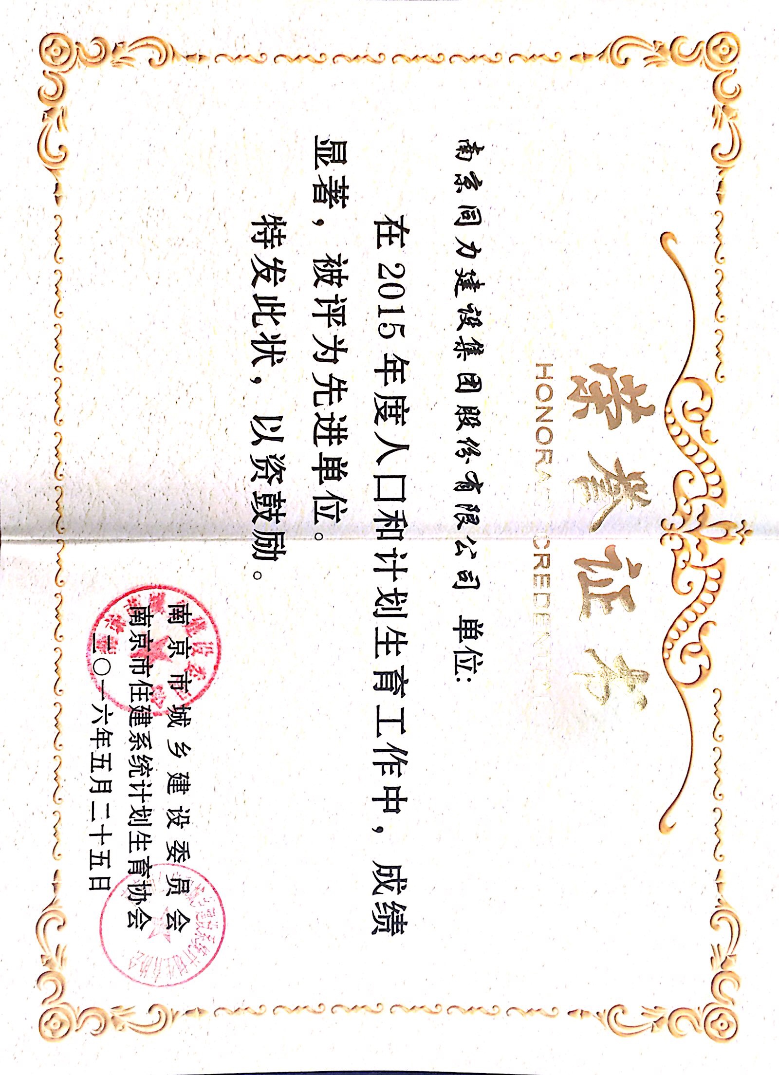 公司被評為“2015年度人口和計劃生育先...