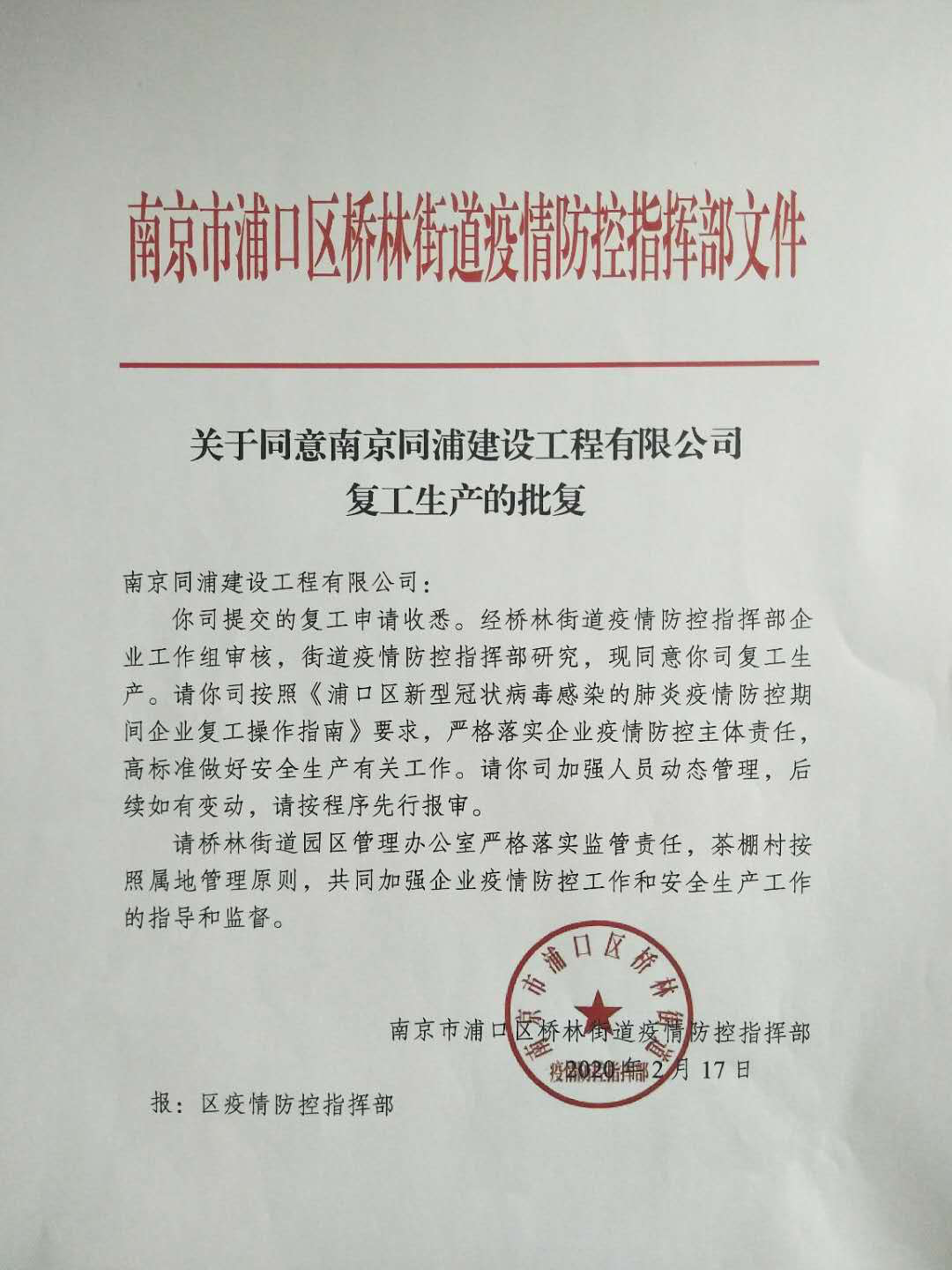 在同力建設領導的關心指導下,同浦公司魏強董事長親任同浦公司防疫工作領導小組組長,同浦公司總經理徐雪華任副組長,自2月2日起,按照屬地政府橋林街道園區辦的復工政策要求,全面組織準備各項防疫物資、復工申報材料,2月10日正式提交復工申請。經多方努力跟進,2月17日,同浦公司取得復工批復,為茶棚工業園區第一家復工企業。