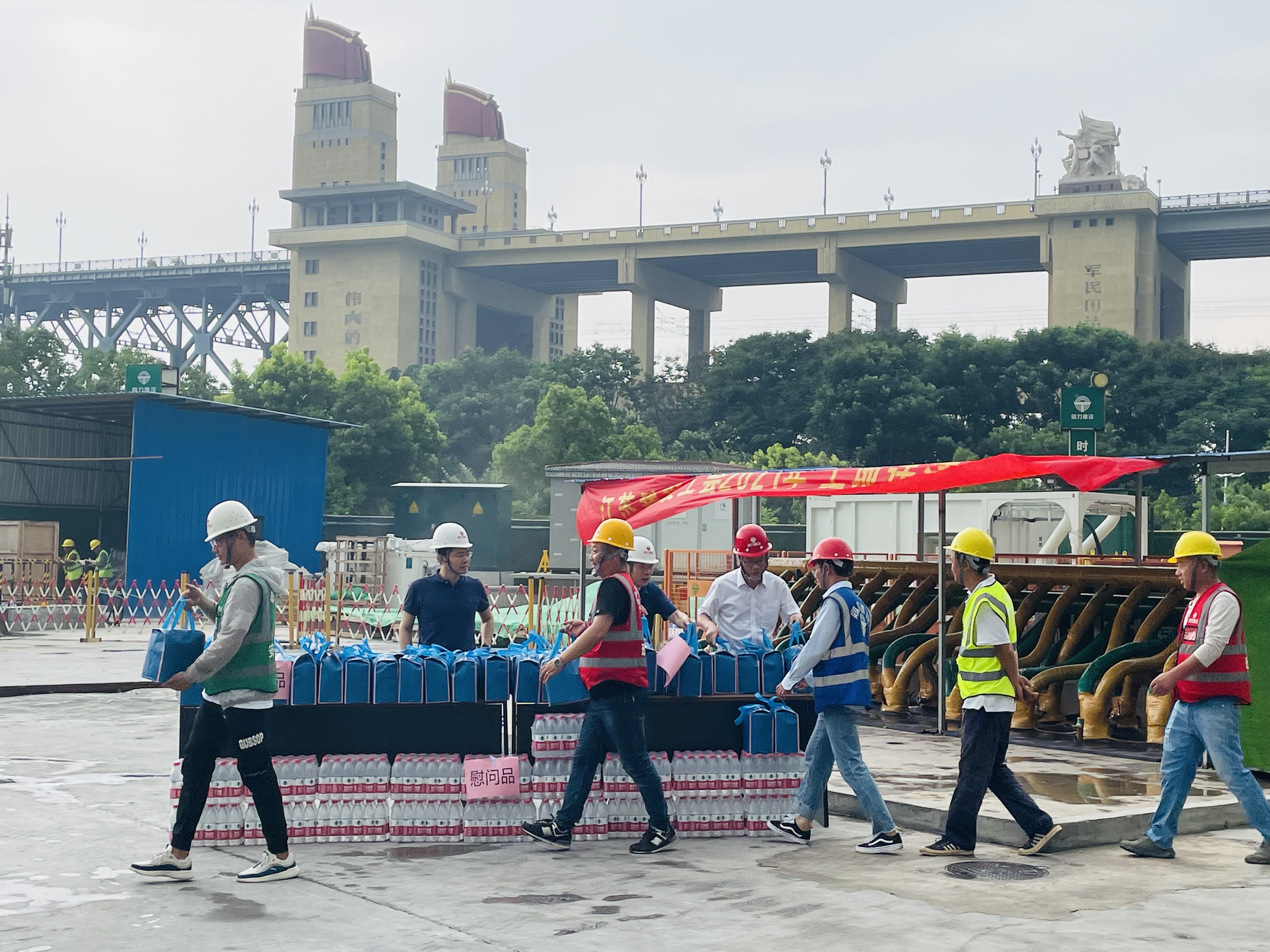 7月16日,江蘇省建設工會領導佘玉龍、徐為軍,在南京同力建設集團黨總支書記兼工會主席仇偉明的陪同下,來到江北新區水環境一期工程,看望慰問堅守在工程一線的員工們。