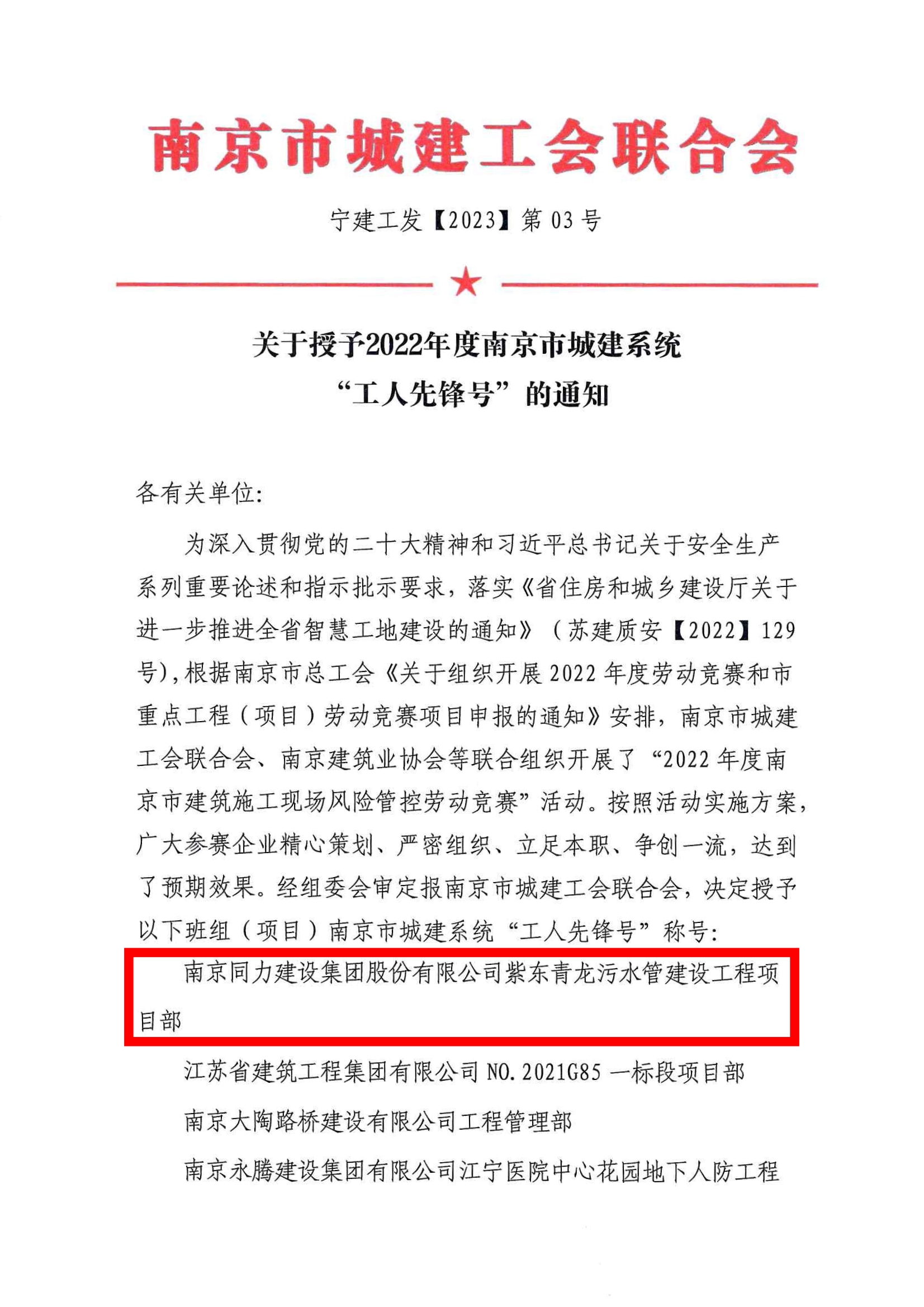 近日,南京市城建工會聯合會下發寧建工發[2023]第03號文《關于授予2022年度南京市城建系統“工人先鋒號”的通知》,其中南京同力建設集團股份有限公司紫東青龍污水管建設工程項目部獲2022年度南京市城建系統“工人先鋒號”稱號,繼該項目被評選為南京市智慧化工地、南京市差別化工地、南京市水務2021年市級文明工地后獲得又一殊榮,提升了企業影響力。