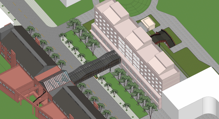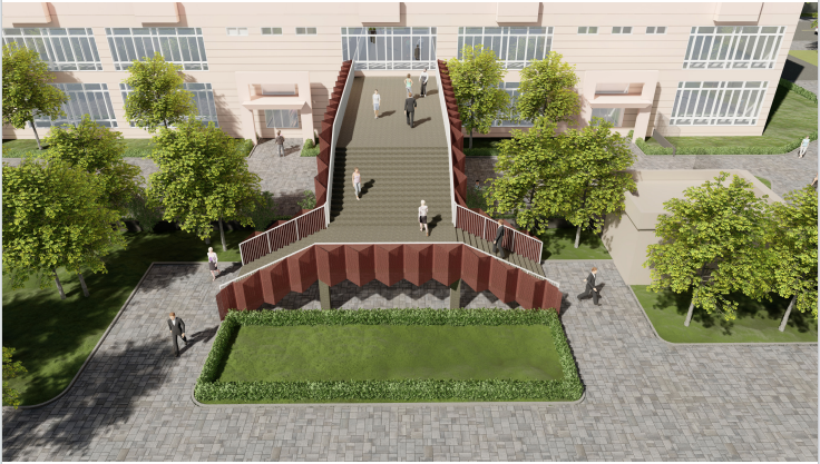 人行過街天橋總長37m,寬6m,總高9m,在北校區新建鋼筋混凝土室外樓梯,新建室外樓梯和過街天橋通過北校區內通道相連。天橋及室外樓梯外側采用玻璃幕墻、鋁格柵、穿孔鋁板裝飾,創造出一座充滿節奏和韻律,又能彰顯人文氣質的城市地標天橋。